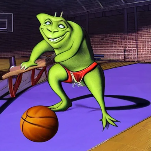 Prompt: Walter white playing basketball against shrek in a basketball stadium