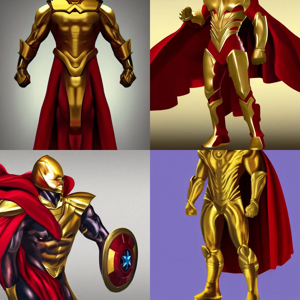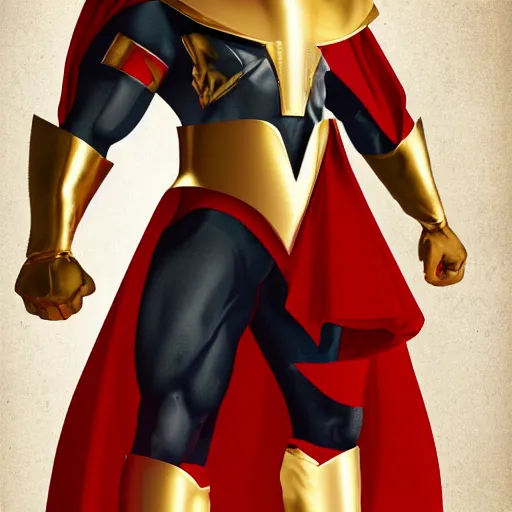 Muscular superhero in simple gold armor with a red flowing cape standing heroically, digital concept art