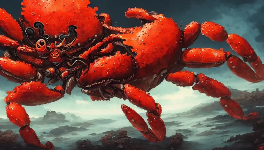 A detailed oriental crab made of lava and rust in the style of anime by Peter Mohrbacher, anime trending on artstation, background of a volcane landscape by Kelly Mckernan