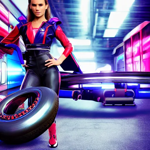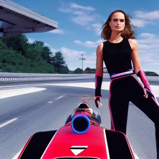 photo of Natalie Portman in video game F-Zero, standing next to a racing machine, fine art photography 8k