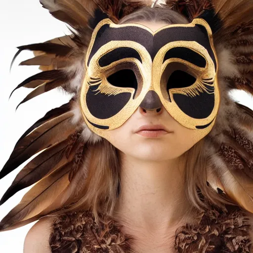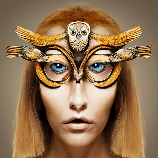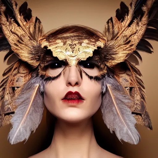 head and upper torso, portrait of a beautiful woman wearing a realistic owl mask with feathers. O...Show more