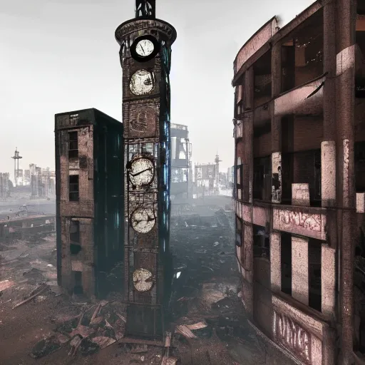 a clock tower in an abandoned apocalyptic city, cyberpunk aesthetic