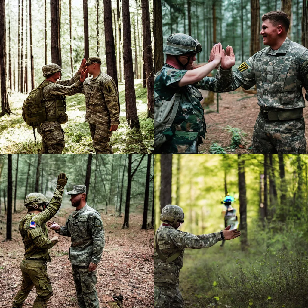 modern army soldier high fiving a bear in the woods, photogrph, long telephoto lens