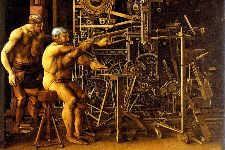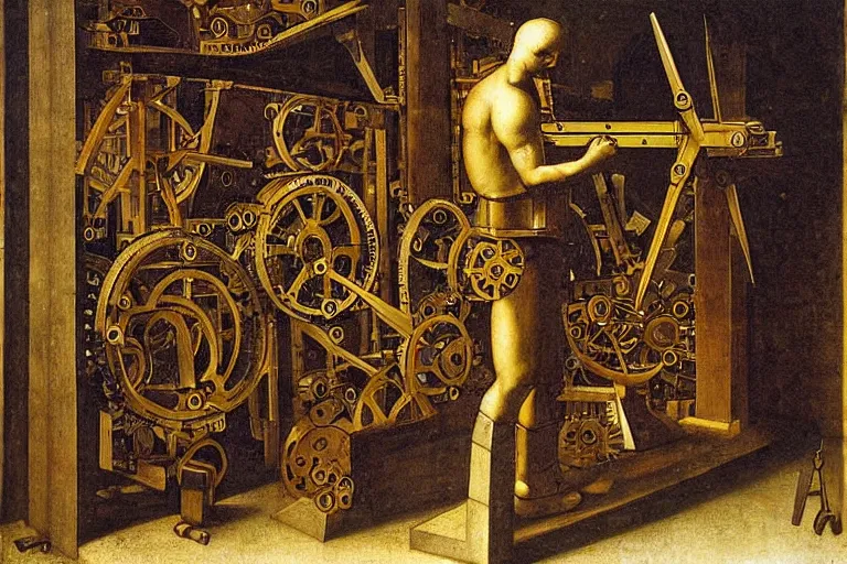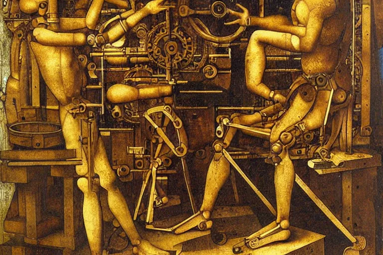 mechanical man with clockwork mechanisms in a workshop | Leonardo Da Vinci |