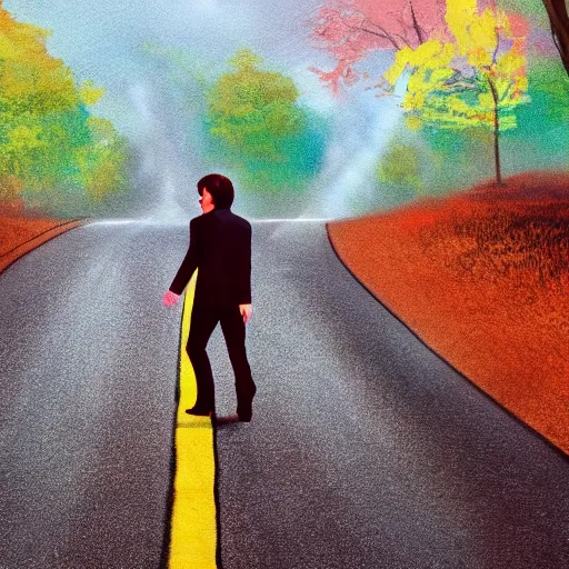 sad Paul McCartney walking a long and winding road trending on artstation 8k high quality very coherent art