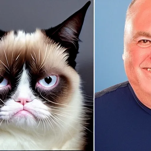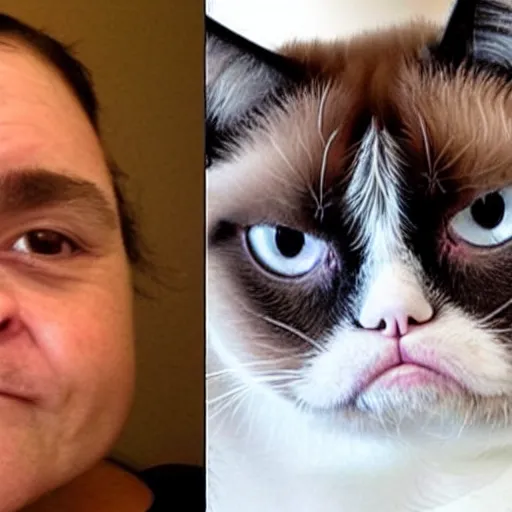 top half of image is grumpy cat down to his nose, bottom half of image is a picture of person smiling from the nose down