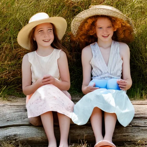 Two sisters aged 8 to 9 sitting on the bank, relaxing on a sunny day vintage picture, hyper-realistic, clear day, 8k resolution, maximum detail