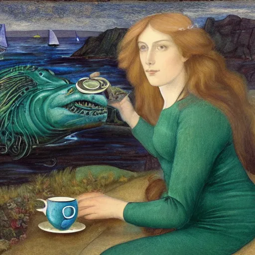 pre-Raphaelite painting of a sea monster enjoying a cup of tea in a jet car