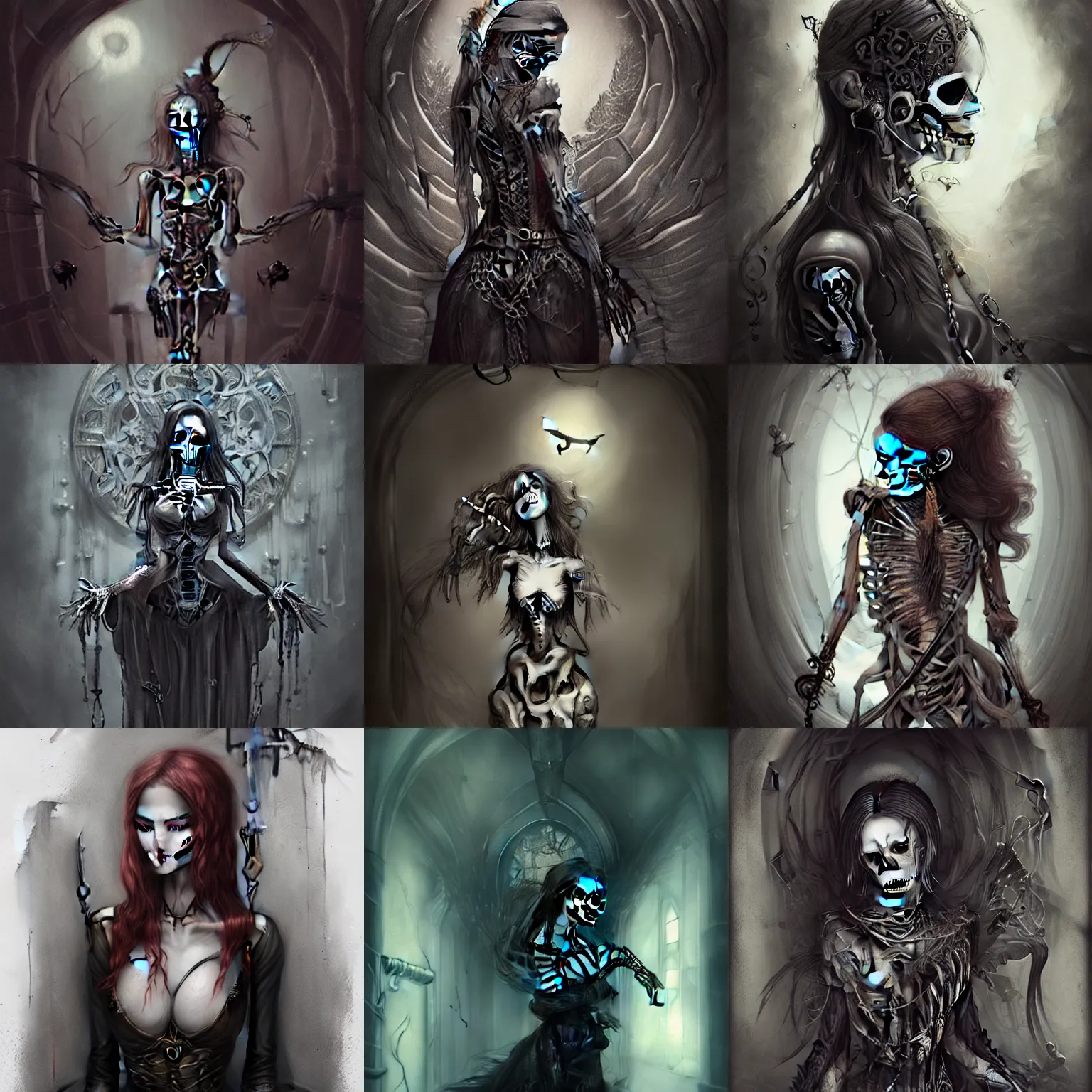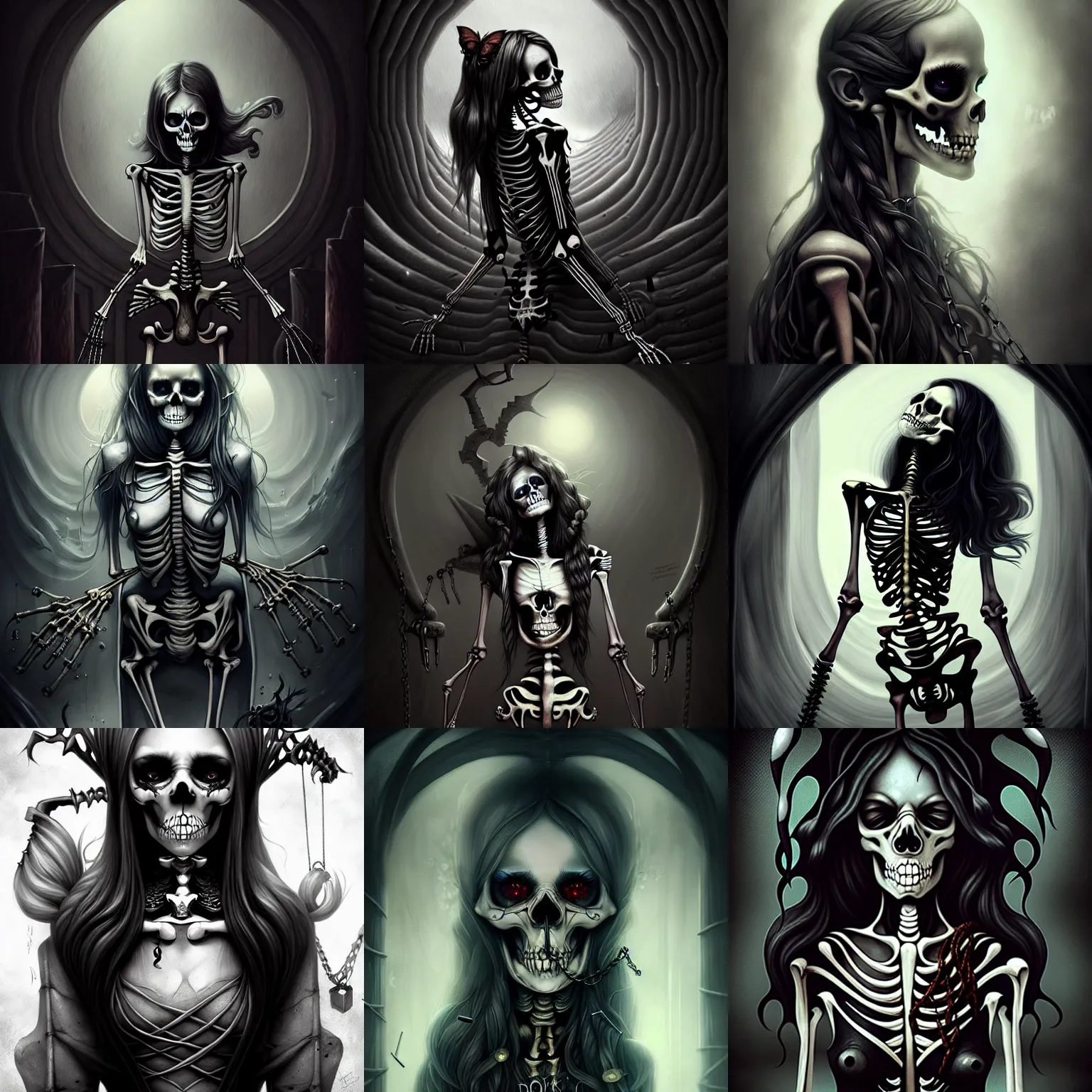 a skeleton chained to the wall in a gloomy dungeon, Anna Dittmann style, dark, gothic, detailed, sharp, digital art, surreal, featured on artstation, HD, 8K, highly detailed, masterpiece