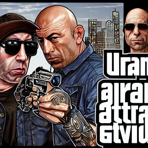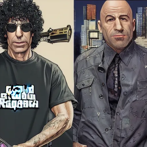 Joe Rogan and Howard Stern, in style of Grand Theft Auto, intricate, highly detailed, concept art, smooth, sharp focus, illustration, angry, medium shot, mid-shot
