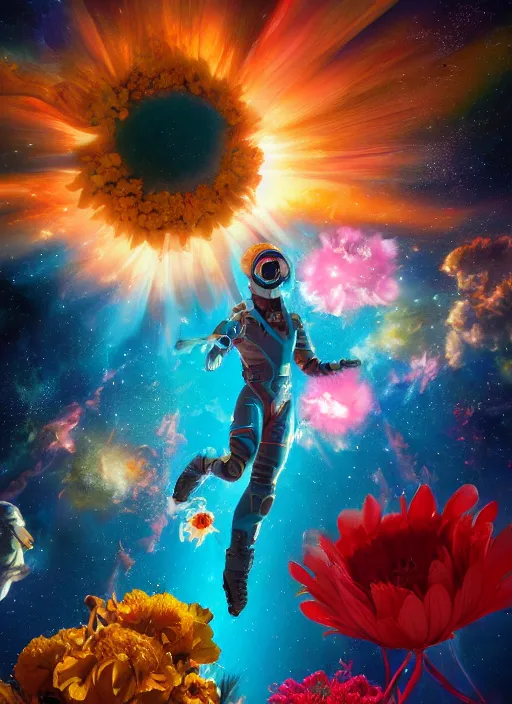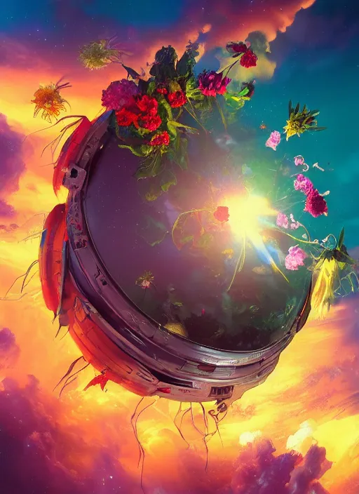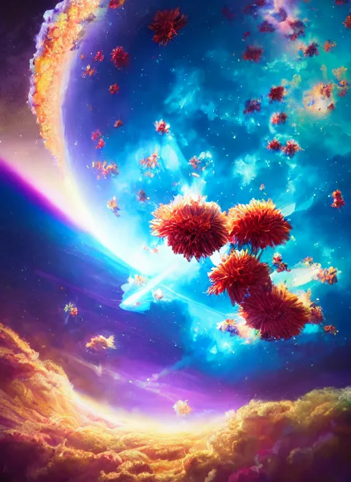 An epic fantastic realism comic book style painting of the most beautiful flowers launched into s...Show more