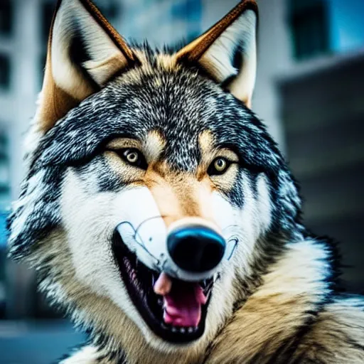 portrait of a wolf fursuit at a furry convention, indoors, realisitc photo