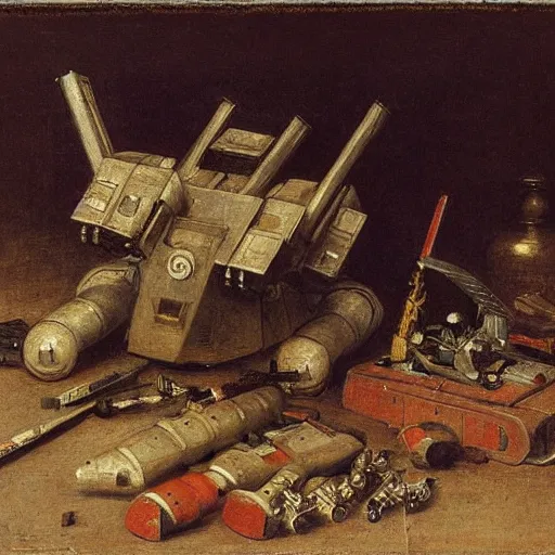 Still life of a battle robot surrounded by his weapons, by Henri Fantin-Latour