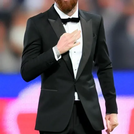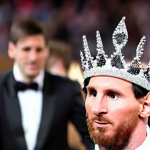 photograph of Messi wearing a crown while dressed in a black tuxedo