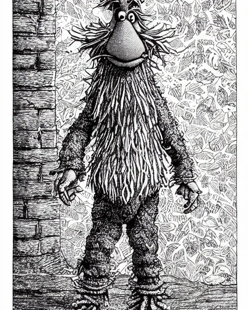 an illustration of a fraggle, full body, standing in rectangular border, pen-and-ink illustration, etching, by Russ Nicholson, DAvid A Trampier, larry elmore, 1981, HQ scan, intricate details