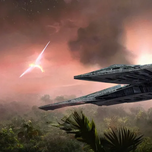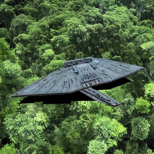 a star destroyer from star wars crashed in a jungle, photorealistic