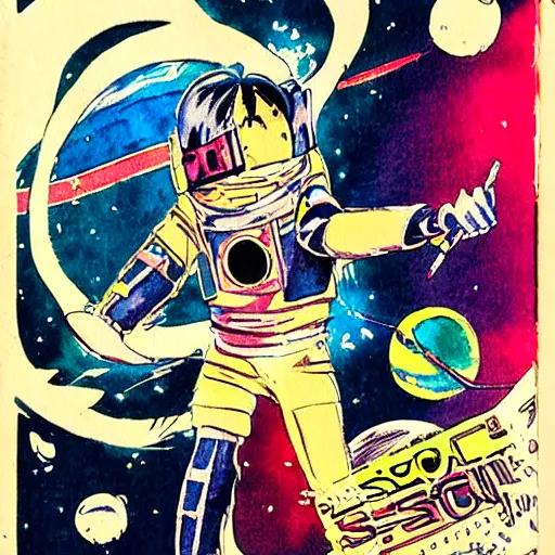 a vintage anime 70s comic book watercolor of Alex Jones in space