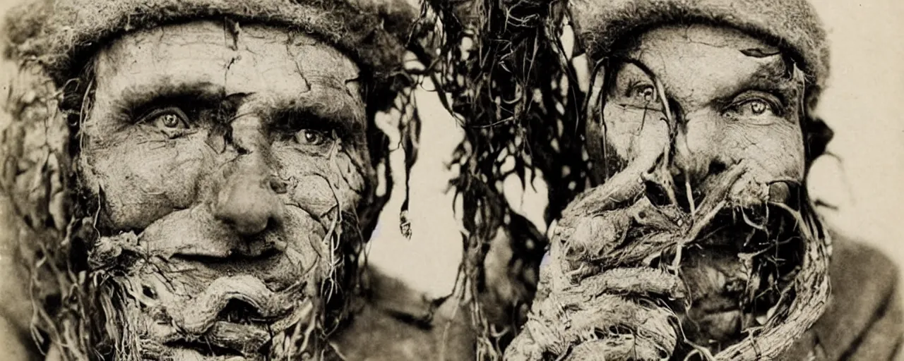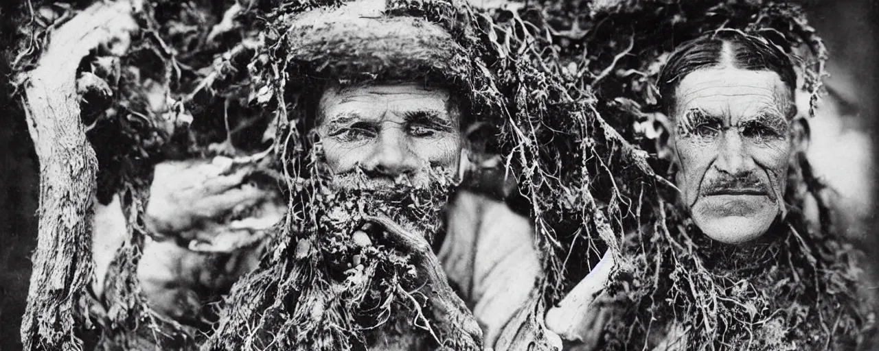 1920s portrait photography of alpine old farmer transforming into a monster, roots growing out of his face