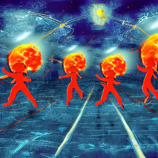 people running away from a tiny nuclear explosion, at night, digital art