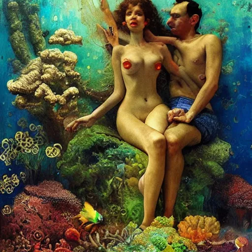 a beautiful underwater portrait of two lovers surrounded by smoke mushrooms and coral reefs and c...Show more