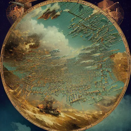 A beautiful painting of a vintage network map with communities seen from above by Ivan Aivazovsky, Dan Mumford, H. R. Giger and Ernst Max