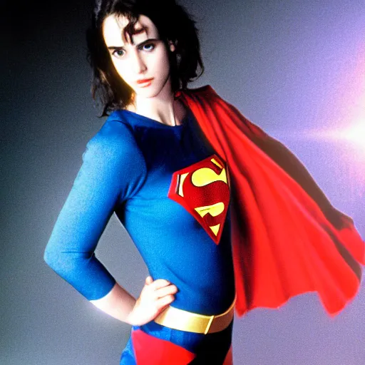 Young Winona Ryder as Super Girl, 30mm, studio lighting, photo shoot, movie still