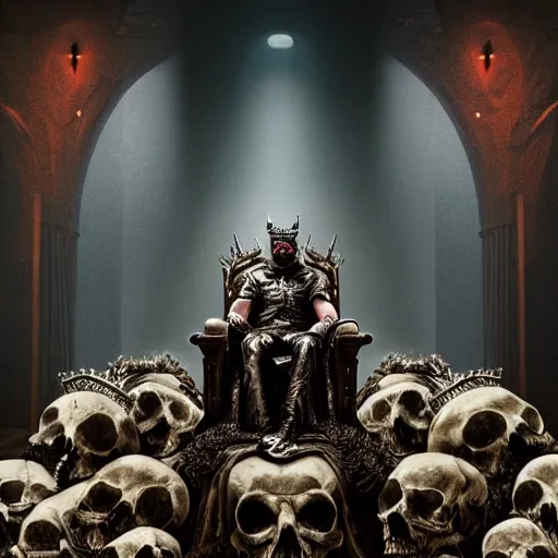 an ominous king sitting on a throne of skulls, grand perspective, studio lighting, 4k ultra hd, fantasy dark art