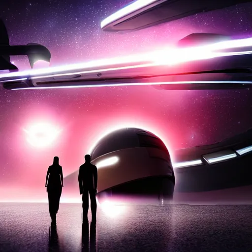 silhouette of two people futuristic background starship cyber digital art rendering octane UE5 2K
