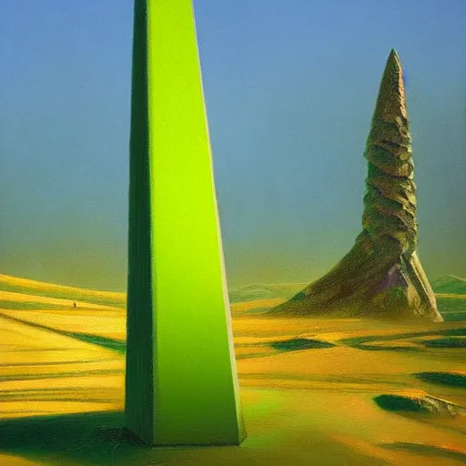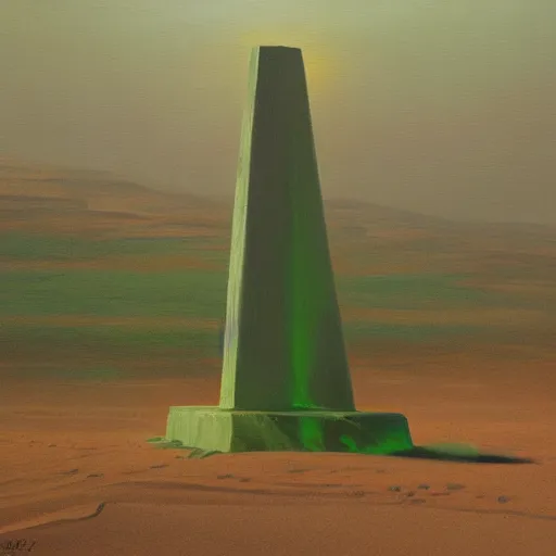 A very highly detailed oil painting by Greg Rutkowski of a tall green obelisk made of crystals, glowing bright green in the middle of a very sandy desert.