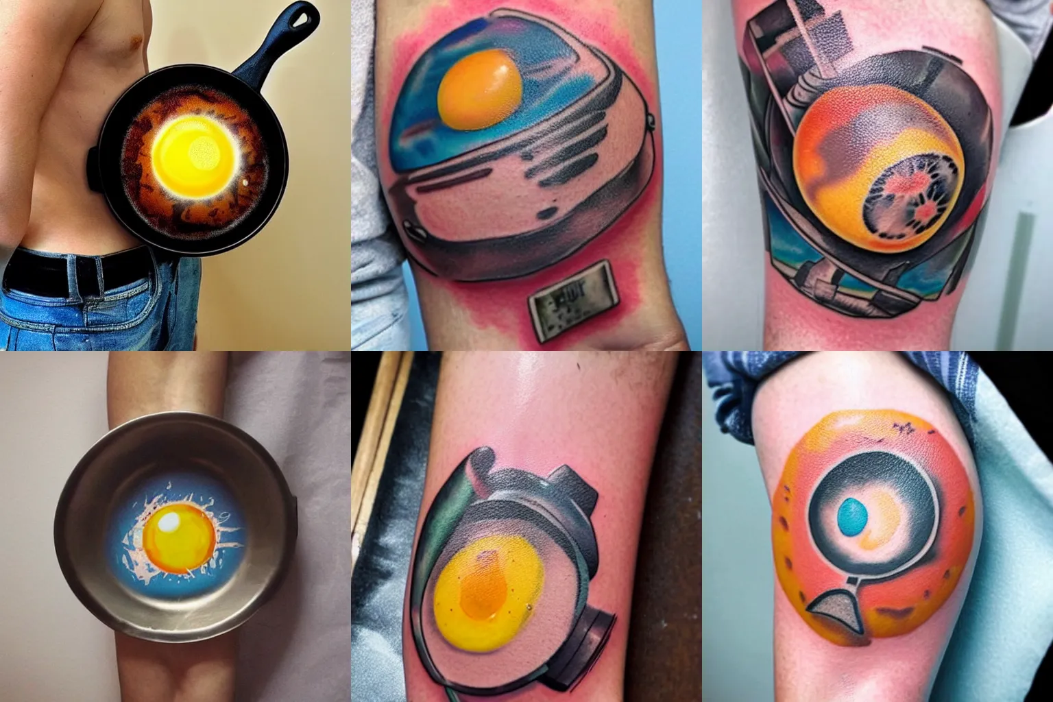 tattoo of cartoon frying pan with a fried egg inside