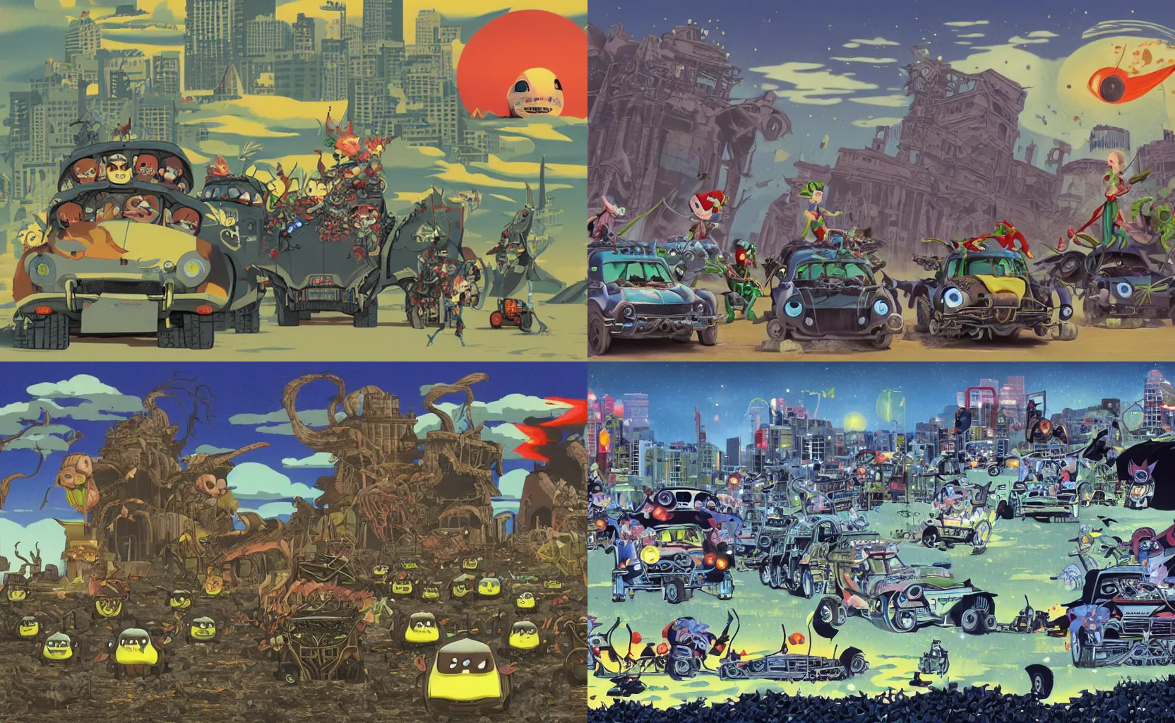 devilish goblins riding mad max cars through an abandoned city by Chiho Aoshima