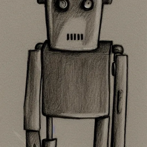 pencil sketch of a skinny outdated awkward robot with joints that creak and a triangular head with 2 antenna