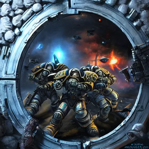 historical photo of Warhammer 40k space marines emerging from a Stargate, hyper real, extremely detailed, 4K