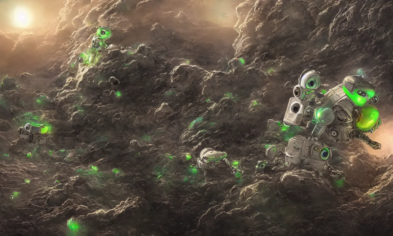 cute NASA robots working on the surface of the moon with green aliens, vivid colors, high details...Show more