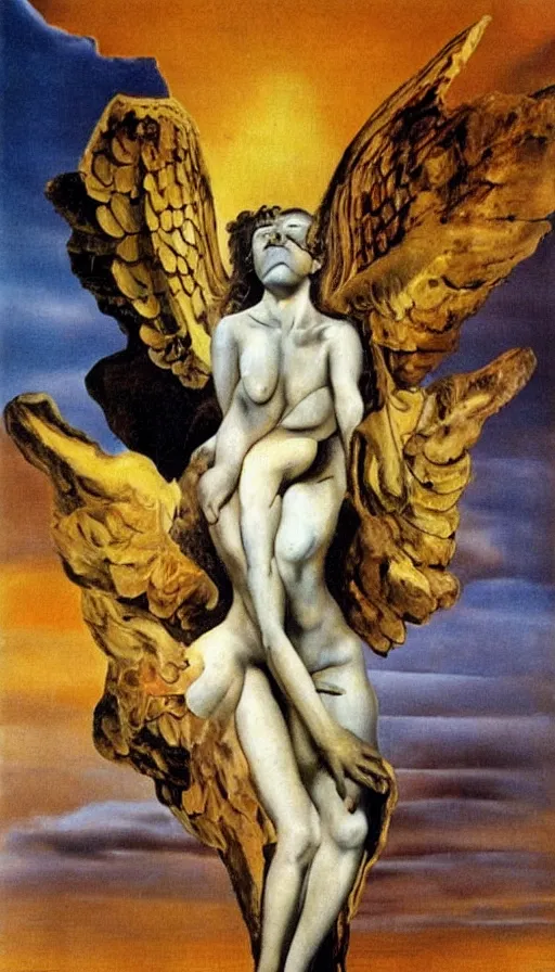Prompt: realistic detailed statue of the terrific sacred destruction angel made with marble and with stained rust golden wings, body full of scars, made by Karol Bak, Mark Brooks and Bernini. Rich colors. Beksinski and Gerhard Richter painting. Masterpiece