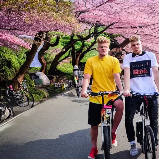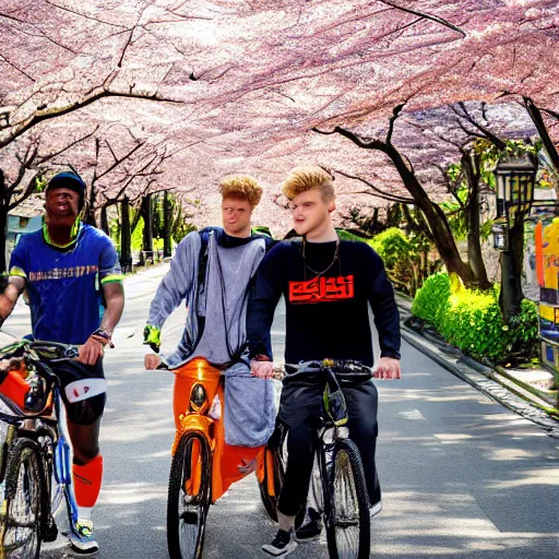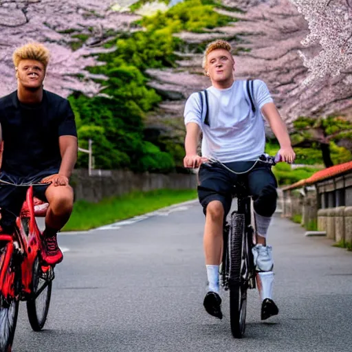 ksi and jake paul are riding bikes together in japan through a beautiful street in japan filled with cherry blossoms, 8k, golden hour, highly detailed, award winning photo