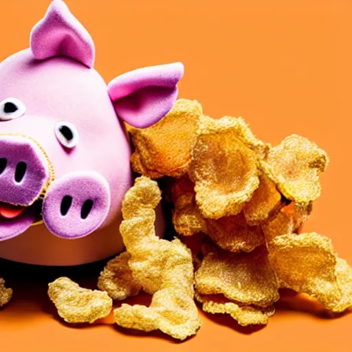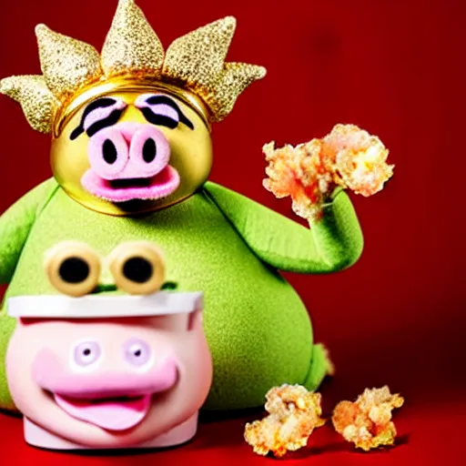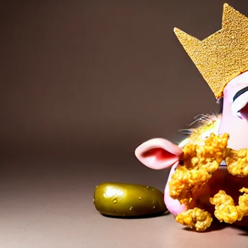 studio photograph of a pig wearing a gold crown depicted as a muppet eating pork rinds surrounded by pickles