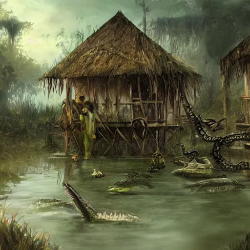 haunted village on swamp with crocodiles, artwork by WLOP