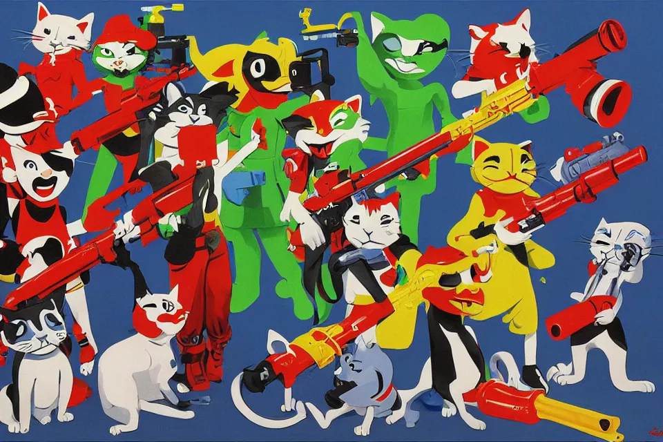 concept paintings of cats holding supersoaker water guns, by jamie hewlett