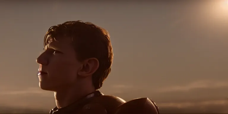 still frame from a movie, wide shot of an relieved tom holland in a knight suit in the center, urban, rule of third, alexa 65, cooke prime 25mm, cinematic, film grain, flare