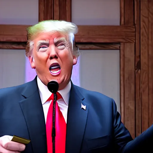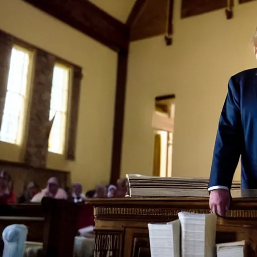 Cinematic still of Donald Trump holding a Bible, speaking in a Baptist church in rural Alabama