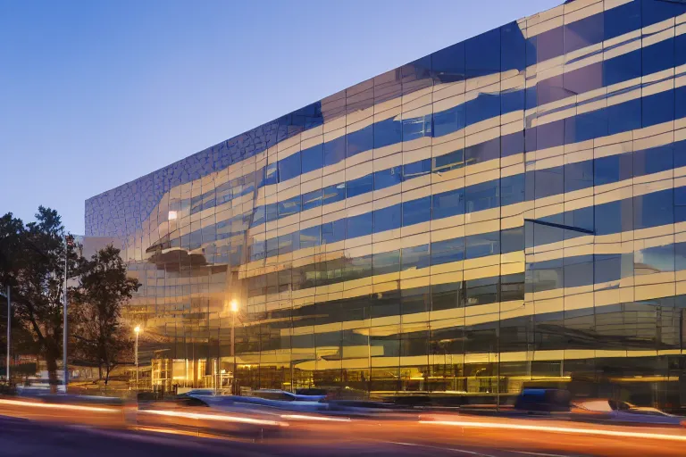a beautiful office building exterior with sleek modern design by Gensler and large windows, golden hour, professional photogrtaphy