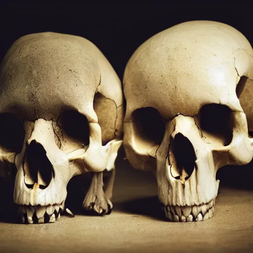 a still photography of a lion skull and a young male human skull facing each other, detailed, 4k, fantasy, framed