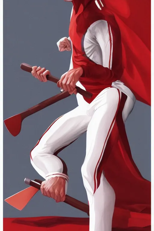 full body view of a very skinny white man super villain that wears a red adidas track suit and wi...Show more