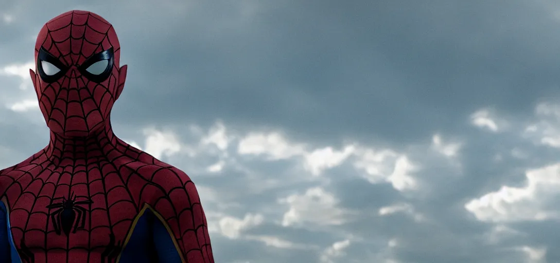 Walter White as Spider-Man, film still, wide-shot, full shot, cinematic lens, heroic portrait