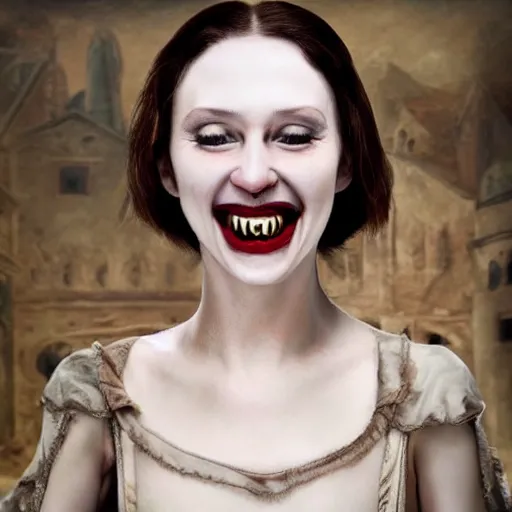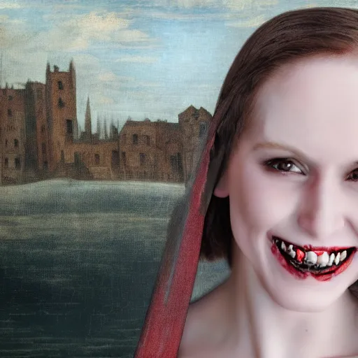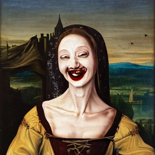 extremely ugly pale vampire woman smiling with skin condition in expensive renaissance dress, Renaissance painting, Renaissance Port City background, vampire teeth, 1450