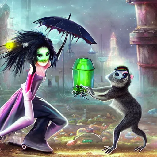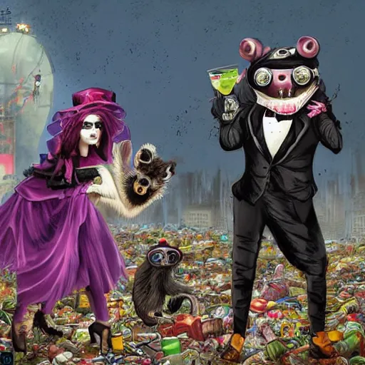 Monkey in a Victorian era cyber punk dress dancing in a landfill with a vampire racoon and a goth fairy frog, hyper realistic, cgsociety,