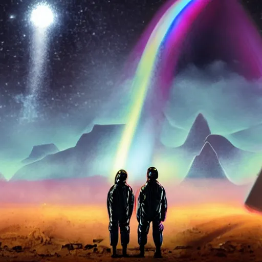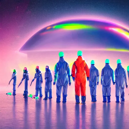 People in hazmat suits holding flashlights peering at gigantic iridescent alien structures in the distance of a deep dark pit, establishing shot, cinematic