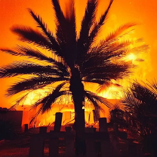 “a single burning palm tree at night in a desolate graveyard 🪦 with fiery burning bright embers falling from the night sky. Photograph. Cursed image.”