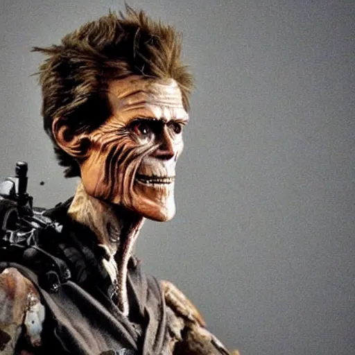 grainy recovered photo of animatronic Willem Dafoe by Stan Winston studios trashed destroyed lying broken in a landfill post apocalyptic gloom discarded exposed inner machinery detailed